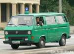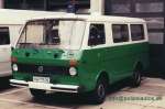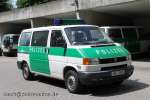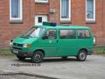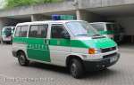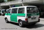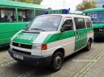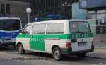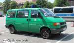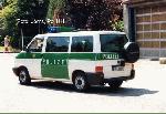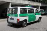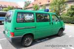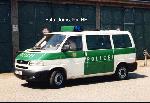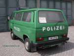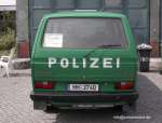 Halbgruppenkraftwagen (HGruKW) der Hamburger Bereitschaftspolizei, ausgestattet mit 2 Schiebetüren und Anhaltesignalgeber am Heck. Im Gegensatz zu diesem T4 LR mit größerem Polizeischriftzug auf der Hecklappe. |