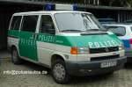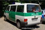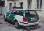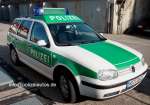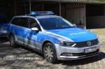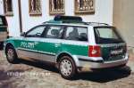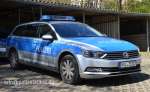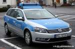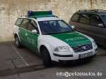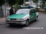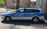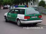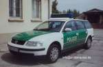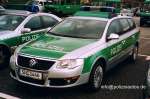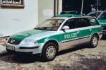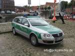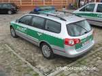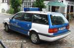Funkstreifenwagen der Polizei Mecklenburg-Vorpommern im klassischen Design. Die beweglichen Teile wurden mittels Folie grün markiert. Im Gegensatz zu anderen bekannten Gestaltungsvarianten dieses Passats wurde bei dem Fahrzeug die Motorhaube in einem Stück beklebt und mit einem kleinen POLIZEI-Schriftzug versehen. |