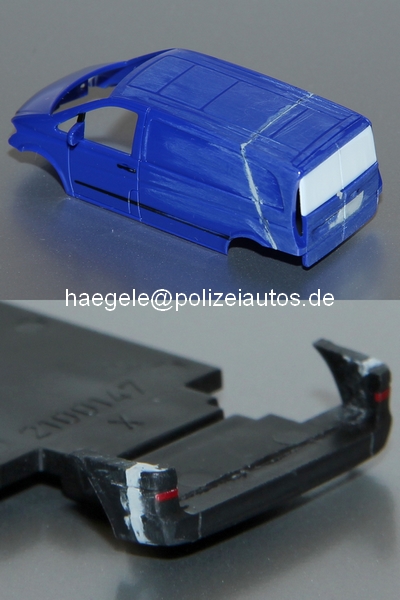 Außerdem war es erforderlich, anstelle der Heckklappe zwei Flügeltüren anzudeuten und dazu u. a. die Kennzeichenhalterung bzw. -vertiefung zu verlegen.