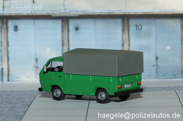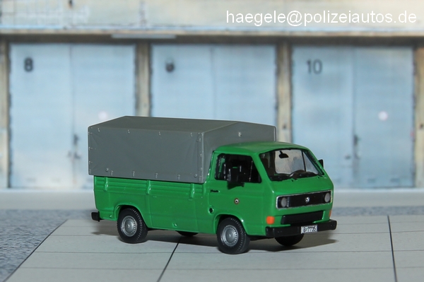 Kleintransporter (seriennah), Berlin 1:87 VW Transporter T3 Pritsche/Plane Grundmodell: Roco Maßstab:1:87 Einsatzgebiet des Vorbilds: Logistikfahrzeuge Berlin5680 Aufrufe seit 04.05.2012 Das Grundmodell wurde umlackiert und Details (u. a. der silberne Rahmen des Kühlergrills) wurden farblich hervorgehoben. Originalgetreue Kennzeichen schließen diesen einfachen Umbau ab (Haegele). Zur Liste --- Serien- oder Sondermodelle --- Maßstab 1:43- Polizei Brandenburg 1:43- Bundespolizei (ehem. BGS ) 1:43- Polizei Hamburg 1:43- Polizei Niedersachsen 1:43- Polizei Nordrhein-Westfalen 1:43- Polizei Bayern 1:43- Polizei Berlin 1:43- Volkspolizei 1:43 Maßstab 1:87- Bundespolizei (1:87)- Feldjäger 1:87- Polizei Bremen 1:87- Polizei Hamburg 1:87- Bundesgrenzschutz (1:87)- Polizei Mecklenburg-Vorpommern 1:87...- Ordnungsamt (1:87)- Polizei Baden-Württemberg 1:87- Polizei Bayern 1:87- - Bereitschaftspolizei Bayern 1:87- - Kleintransporter (seriennah), Bayer...- - Pkw (seriennah), Bayern 1:87- Polizei Berlin 1:87- - Eigenbauten, Berlin 1:87- - Kleintransporter (seriennah), Berli...- - LKW (seriennah), Berlin 1:87- - PKW (seriennah), Berlin 1:87- Polizei Brandenburg 1:87- Polizei Hessen 1:87- Polizei Niedersachsen 1:87- Polizei Nordrhein-Westfalen 1:87- Erprobungsfahrzeuge 1:87- Polizei Rheinland-Pfalz 1:87- Polizei Sachsen 1:87- Polizei Schleswig Holstein 1:87- Polizei Thüringen 1:87- Polizei Sachsen-Anhalt 1:87- Volkspolizei 1:87- Modelle im Einsatz (Dioramen) 1:87- Zoll 1:87 Maßstab 1:160 Sonstige Maßstäbe