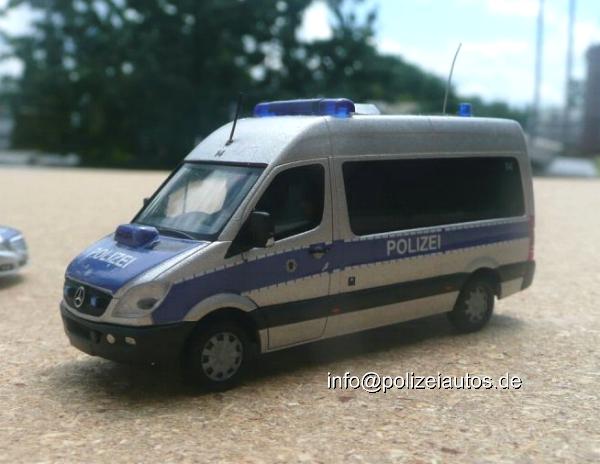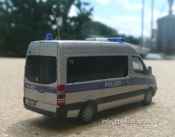 Ein Herpa-Modell wurde silber lackiert und mit eigens angefertigten Decals ausgestattet. Der Blaulichtbalken stammt von Herpa, die Dachklimaanlage ist ein Eigenbau. Umbau: Thomas Engel (Bisher leider kein Originalbild vorhanden)