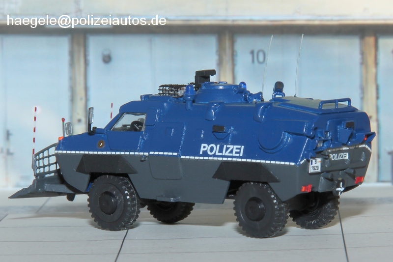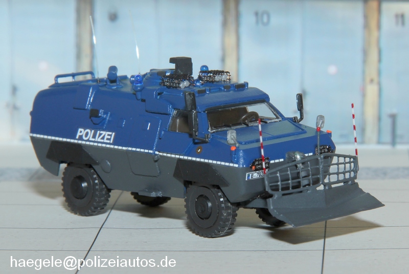 Eigenbauten, Berlin 1:87 Sonderwagen 4 Grundmodell: Eigenbau Maßstab:1:87 Einsatzgebiet des Vorbilds: Sonderwagen und Wasserwerfer Berlin5750 Aufrufe seit 09.03.2014 Der ursprünglich für die Farbstudie von Polizeiautos.de gebaute SW 4 wurde nach dem Berliner Vorbild umgerüstet und dabei unter anderem mit einem Räumschild ausgestattet (Haegele). Zur Liste --- Serien- oder Sondermodelle --- Maßstab 1:43- Polizei Brandenburg 1:43- Bundespolizei (ehem. BGS ) 1:43- Polizei Hamburg 1:43- Polizei Niedersachsen 1:43- Polizei Nordrhein-Westfalen 1:43- Polizei Bayern 1:43- Polizei Berlin 1:43- Volkspolizei 1:43 Maßstab 1:87- Bundespolizei (1:87)- Feldjäger 1:87- Polizei Bremen 1:87- Polizei Hamburg 1:87- Bundesgrenzschutz (1:87)- Polizei Mecklenburg-Vorpommern 1:87...- Ordnungsamt (1:87)- Polizei Baden-Württemberg 1:87- Polizei Bayern 1:87- - Bereitschaftspolizei Bayern 1:87- - Kleintransporter (seriennah), Bayer...- - Pkw (seriennah), Bayern 1:87- Polizei Berlin 1:87- - Eigenbauten, Berlin 1:87- - Kleintransporter (seriennah), Berli...- - LKW (seriennah), Berlin 1:87- - PKW (seriennah), Berlin 1:87- Polizei Brandenburg 1:87- Polizei Hessen 1:87- Polizei Niedersachsen 1:87- Polizei Nordrhein-Westfalen 1:87- Erprobungsfahrzeuge 1:87- Polizei Rheinland-Pfalz 1:87- Polizei Sachsen 1:87- Polizei Schleswig Holstein 1:87- Polizei Thüringen 1:87- Polizei Sachsen-Anhalt 1:87- Volkspolizei 1:87- Modelle im Einsatz (Dioramen) 1:87- Zoll 1:87 Maßstab 1:160 Sonstige Maßstäbe