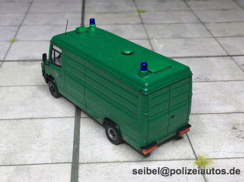 Das Herpa T2 Modell wurde aufwendig gekürzt und eine einzelne Drehtür an der Seite anstelle der Schiebetür aus Plastikprofilen verbaut. Das Modell wurde lackiert und mit allen Details wie Blaulichtern und Antennen ausgestattet.