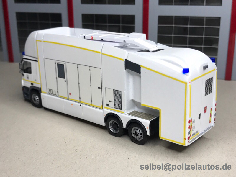 Das Modell entstand abgesehen vom Herpa Actros Fahrerhaus komplett in Eigenbau. Der Aufbau wurde aus einem Plastikblock "geschnitzt" und sämtliche Decals wurden selber gezeichnet sowie gedruckt. Der ausfahrbare Röntgenarm auf dem Dach entstand aus Plastikprofilen.