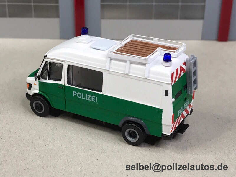 Der geschlossene Transporter von Herpa wurde seitlich mit Fenstern versehen und vorbildlich lackiert. Desweiteren wurde eine aufwendige Dachplattform aus Profilen gebaut und eine Heckwarnmarkierung dargestellt. Details wie die Klappleiter am Heck, Inneneinrichtung und eine Dachluke runden den Umbau ab.