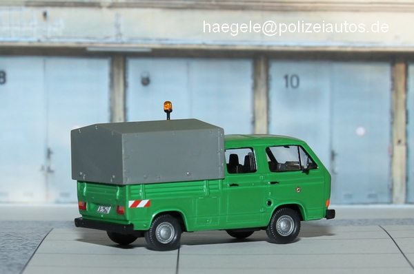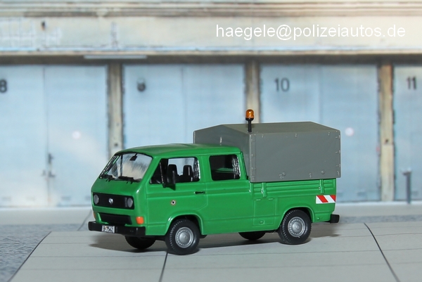 Kleintransporter (seriennah), Berlin 1:87 VW Transporter T3, Doppelkabine Grundmodell: Roco Maßstab:1:87 Einsatzgebiet des Vorbilds: Logistikfahrzeuge Berlin5030 Aufrufe seit 04.05.2012 Das Grundmodell wurde umlackiert und Details wurden farblich hervorgehoben. Originalgetreue Kennzeichen, Warnmarkierungen am Heck und eine gelbe Rundumleuchte schließen diesen einfachen Umbau ab (Haegele). Zur Liste --- Serien- oder Sondermodelle --- Maßstab 1:43- Polizei Brandenburg 1:43- Bundespolizei (ehem. BGS ) 1:43- Polizei Hamburg 1:43- Polizei Niedersachsen 1:43- Polizei Nordrhein-Westfalen 1:43- Polizei Bayern 1:43- Polizei Berlin 1:43- Volkspolizei 1:43 Maßstab 1:87- Bundespolizei (1:87)- Feldjäger 1:87- Polizei Bremen 1:87- Polizei Hamburg 1:87- Bundesgrenzschutz (1:87)- Polizei Mecklenburg-Vorpommern 1:87...- Ordnungsamt (1:87)- Polizei Baden-Württemberg 1:87- Polizei Bayern 1:87- - Bereitschaftspolizei Bayern 1:87- - Kleintransporter (seriennah), Bayer...- - Pkw (seriennah), Bayern 1:87- Polizei Berlin 1:87- - Eigenbauten, Berlin 1:87- - Kleintransporter (seriennah), Berli...- - LKW (seriennah), Berlin 1:87- - PKW (seriennah), Berlin 1:87- Polizei Brandenburg 1:87- Polizei Hessen 1:87- Polizei Niedersachsen 1:87- Polizei Nordrhein-Westfalen 1:87- Erprobungsfahrzeuge 1:87- Polizei Rheinland-Pfalz 1:87- Polizei Sachsen 1:87- Polizei Schleswig Holstein 1:87- Polizei Thüringen 1:87- Polizei Sachsen-Anhalt 1:87- Volkspolizei 1:87- Modelle im Einsatz (Dioramen) 1:87- Zoll 1:87 Maßstab 1:160 Sonstige Maßstäbe