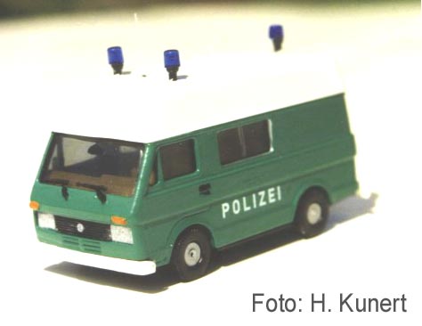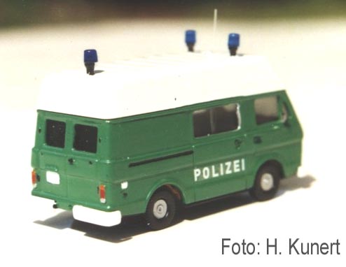 Das Herpa Grundmodell wurde mit Blaulichtern Marke "EIGENBAU" versehen. Frontscheinwerfer, sowie Schiebefenster wurden dem Originalfahrzeug entsprechend umgearbeitet. Nach der Lackierung wurde am Modell die hinteren Scheiben vergittert (angeklebt). Zu guter letzt, originalgetreu beschriftet und mit einer Antenne ausgestattet.