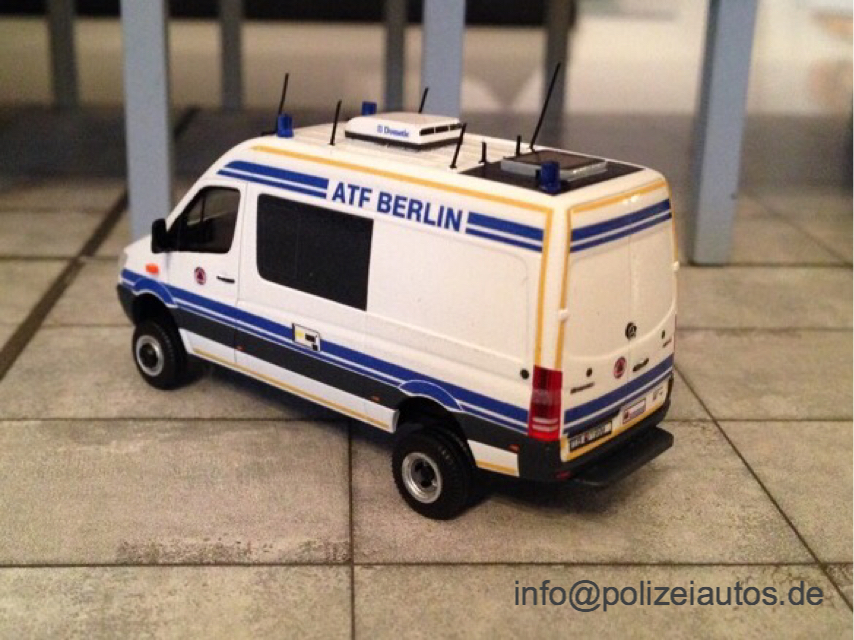Der Kastenwagen von Herpa wurde weiß lackiert und mit DS-Decals versehen. Das Dach wurde aufwendig mit Details versehen wie einer Dachluke, Antennen, Blaulichtern und einer Dachklimaanlage. Das Fahrgestell wurde erhöht, wie bei der originalen 4x4 Allrad Variante.