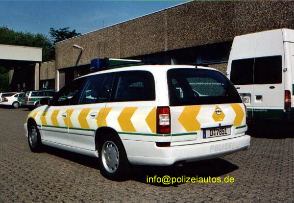 Funkstreifenwagen der Autobahnpolizei NRW in versuchsweiser grün/gelb/weiß reflektierender Farbgebung ("Pfeildesign").