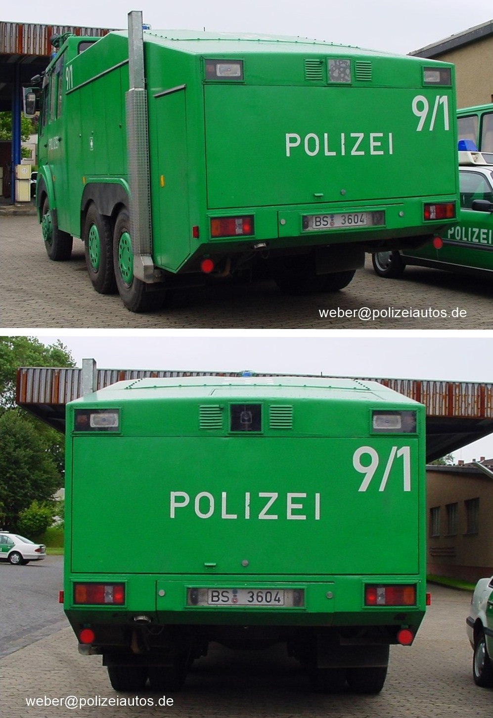 | Beschreibung: | Wasserwerfer 9000 der niedersächsischen Bereitschaftspolizei, hier mit Kennung 9/1 Technische Daten: 280 PS Höchstgeschwindigkeit: 105 km/h 16 Vorwärts- und 2 Rückwärtsgänge Wassermenge: 9070 Liter Tankinhalt Besatzung: 5 Beamte. Bei diesem Fahrzeug werden die Auspuffabgase über Edelstahlrohre (seitlich am Wassertank angebracht) nach oben abgegeben. Hier eine Ausführung ohne diese Vorrichtung. |