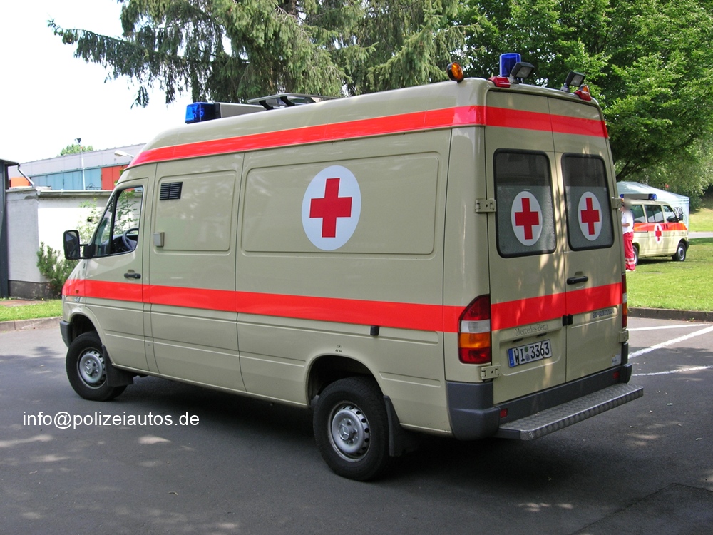 Rettungswagen der hess. Bereitschaftspolizei mit zusätzlichem POLIZEI-Schild an der Stoßstange.