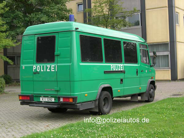 Gruppenkraftwagen mit getönten Seitenscheiben und kleinem Polizei-Schriftzug vorne an der Motorhaube.