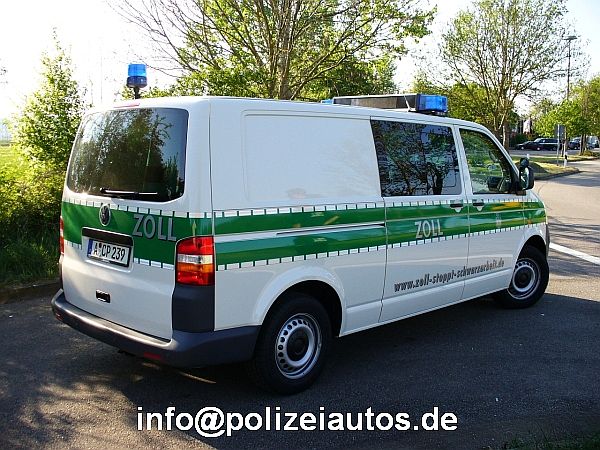 Dienststelle Hauptzollamt Augsburg - FKS Lindau. Erneuerungen gegenüber der alten Version: - Reflexstreifen (beidseitig und hinten), - Heckwarnleuchten (unter der Heckklappe), - Zusätzliche doppelte Außenspiegel, - Arbeitsscheinwerfer (nach vorne - neben ASG), - Arbeitsscheinwerfer (zur Seite - über Schiebetüre), - Vorrüstung "Yelp"-Signal - Ziviles Kennzeichen Signalanlagen: - Hänsch DBS 2000 mit beidseitigem Display (zusätzlich ASiG Motorhaube und ASiG hinter der Heckscheibe) - Hänsch COMET am Heck - Frontblitzer Sputnik Pico - Heckwarnsystem Hänsch Fotos: Johannes W. Im Vergleich zu den bislang bei den VW T5 bekannten Kennungen www.ZOLL.de, wird jetzt wieder die altbewährte Aufschrift ZOLL verwendet. Am Banner www.zoll-stoppt-schwarzarbeit.de unterscheiden sich die Einsatzfahrzeuge der FKS von den übrigen. Auffällig ist sicher die neuartige Zulassung bei den Dienstfahrzeugen der Bundeszollverwaltung. Gemäß den seit 01.03.2007 geltenden Bestimmungen der Fahrzeugzulassungsverordnung werden keine „Behördenkennzeichen“ mehr ausgegeben. Entgegen der ursprünglichen Absicht, bei der Bundeszollverwaltung ein eigenes Bundeskennzeichenkürzel (FV, ZV o.ä.) einzuführen, wie es beispielsweise in Österreich gehandhabt wird, werden nun gewöhnliche (zivile) Kennzeichen des jeweiligen Zulassungsbezirkes mit nachfolgenden Buchstaben-Ziffernkombinationen ausgegeben. |