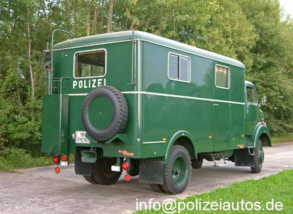 Beschreibung: Dieses speziell für die Hessische Polizei gebaute Sonderkraftfahrzeug gehörte zur mobilen Fernmeldeleitstelle. Im geschlossenen Kofferaufbau ist ein großer Besprechungstisch mit Sitzbänken sowie ein eingebauter Büro- und Geräteschrank samt Arbeitsplatte vorhanden. Die Sitzbänke können bei mehrtägigen Einsätzen zu mehreren Schlafplätzen umgebaut werden. Das Fahrzeug stand seit 1963 im Dienste der Hessischen Polizei und wurde in seinem fast neuwertigen Zustand 1995 dem PMC Marburg übergeben.