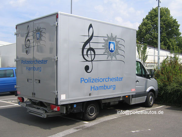 Das Kofferfahrzeug dient zum Transport der Ausrüstung des Polizeiorchester Hamburg und ist hierfür mit einer Ladebordwand am Heck ausgerüstet.