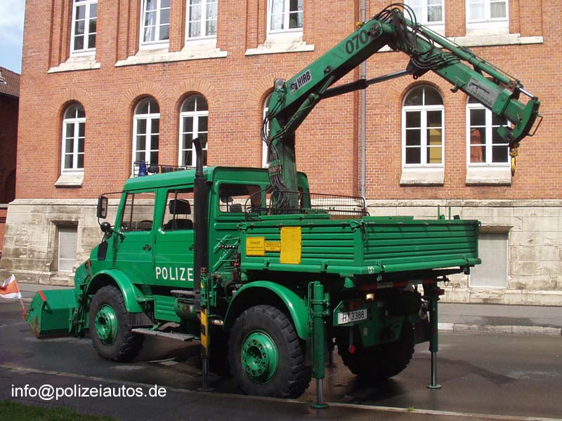 Zugmaschine der Bereitschaftspolizei Niedersachsen mit HIAB-Kran direkt hinter dem Führerhaus, sowie einer SoSi-Anlage mit Astabweiser.