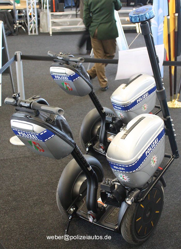 | Beschreibung: | IPOMEX 2009: Segway PT i2 mit Straßenzulassung, als Dienstfahrzeug der Polizei Nordrhein-Westfalen. Technische Daten: Maximale Nutzlast (Fahrer u. Gepäck): 117 kg Mindestgewicht für Fahrer: 45 kg Höchstgewicht für Lasten am Lenker: 4,5 kg Höchstgeschwindigkeit: 20 km/h Energie (aufladbare Akkus):Lithiumion Reichweite bei voll aufgeladenen Akkus: 26-39 km Gerätegewicht ohne Akkus: 37 kg. |
