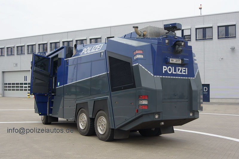 | Beschreibung: | Der WAWE 10 wurde an die Bereitschaftspolizei Hamburg übergeben. Der WAWE ist ingesamt 9,9 Meter lang, 2,55 Meter breit und 3,7 Meter hoch. Rosenbauer gibt ein zulässiges Gesamtgewicht von 31.000 kg an. Im beheizbaren Wassertank werden 10.000 Liter Wasser mitgeführt. Die Pumpenanlage ist im Heck des Fahrzeuges eingebaut und wird mit einem eigenen Pumpenmotor von Deutz angetrieben. Auf dem Dach sind drei Werfer montiert. Fotos: Jörns |