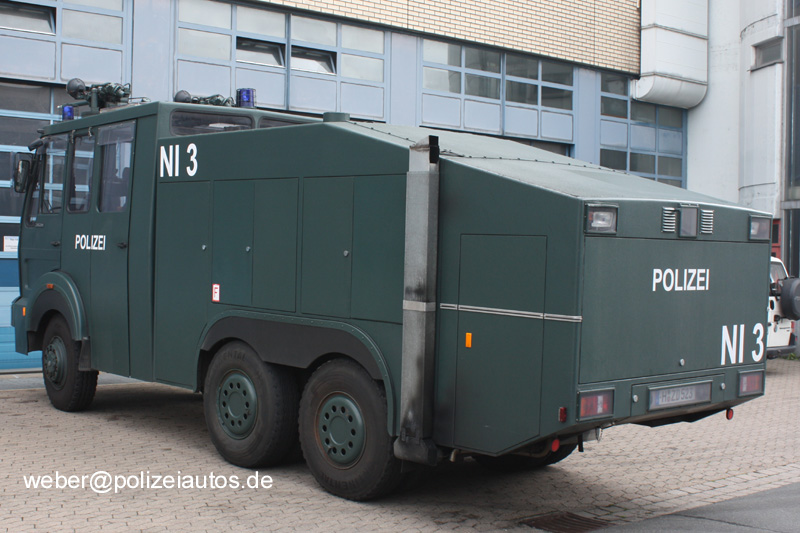 | Beschreibung: | Wasserwerfer der niedersächsischen Bereitschaftspolizei nach Umstationierung mit neuer Zulassung und zusätzlicher Beschriftung: NI 3 |