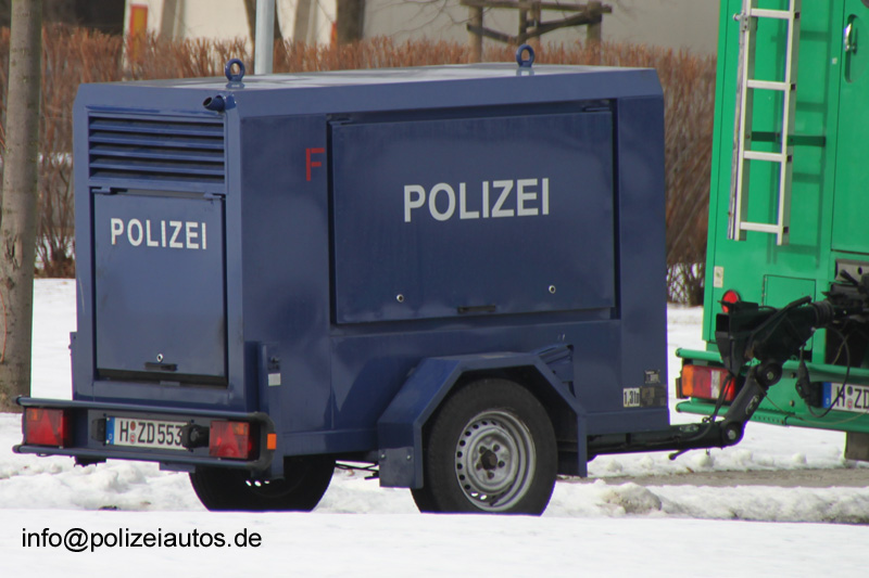 1-achsiger Anhänger mit Notstromaggregat der Bereitschaftspolizei Niedersachsen in kobaltblauer farbgebung.