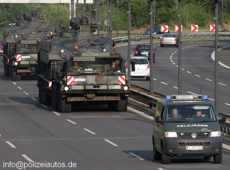 | Beschreibung: | Begleitung von zwei Schwerlasttransportern der Bundeswehr (Elefant), jeweils beladen mit einem Schützenpanzer (Marder), durch die Feldjäger; hinten erfolgt die Absicherung mit einem sog. BF 3 (Fotos: Andreas Jackert). |