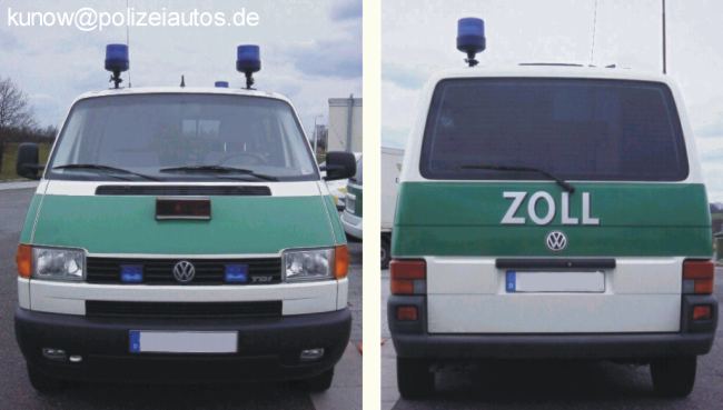 Seit ca. 2001 werden bei den Mobilen Kontrollgruppen (MKG) die bis dato noch im Einsatz befindlichen manilabeige lackierten Sonder-Kfz T4/LR durch farbenfrohe weiß-minzgrüne Versionen ausgetauscht bzw. ergänzt. Die Inneneinrichtung wurde genauso auf die Bedürfnisse abgestimmt, wie die nun deutlichere ZOLL-Kennung im „Polizei-Look“, die auch bereits bei den Pkw Opel Astra Caravan und VW Golf IV Variant verwendet wird. Die drei hellen Stroboskop-Blitzlampen sind besser zu erkennen als die alten "Rundumlichtfunzeln". Die Anhaltesignalgeber sind nun hinten und vorne vorhanden. |