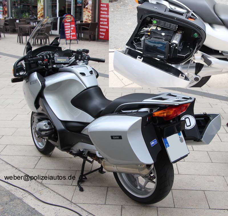 | Beschreibung: | Ziviles Motorrad, ausgerüstet mit einer ProViDa-Anlage zur Verkehrsüberwachung. Hier ausgestellt bei einem Tag der offenen Tür. Im geöffneten Seitenkoffer kann man den Auswerte-Bildschirm erkennen. Fotos: Manfred Wilewka |