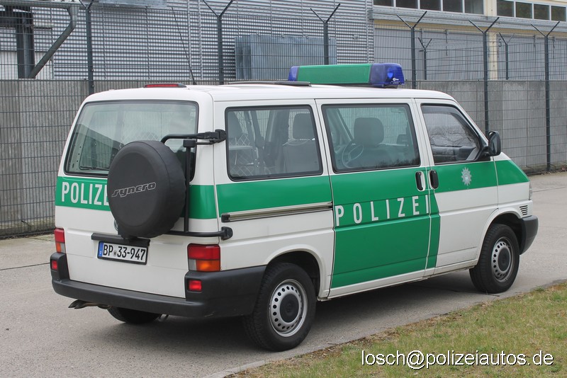| Beschreibung: | Halbgruppenkraftwagen mit Allradantrieb, hier in der bei der Bundespolizei selten anzutreffenden Ausführung mit 2. Schiebetür bei einem grün/weißen VW T4. Als weitere Besonderheit ist auf der Folie der Motorhaube gegenüber anderen grün-weißen VW T4 der Bundespolizei ein wesentlich größerer Polizei-Schriftzug aufgebracht, wie man ihn sonst nur bei VW-Bussen in Bayern findet. |