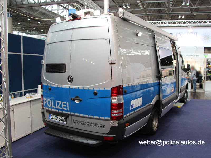 | Beschreibung: | Multifunktionales Führungsfahrzeug der Polizei Sachsen, hier ausgestellt auf der GPEC 2014. Technische Daten:(auszugsweise) Funk: - Analogfunk 2m und 4m - Digitalfunk - Funkmast auf 8 Meter ausfahrbar (Reichweite ca. 30-40km, geländeabhängig) - Antennenanlage zur operativen Bildübertragung Stromversorgung: - drei interne Akkus - Externe Stromversorgung möglich - Dieselnotstromaggregat Medientechnik: - Satellitenempfangsanlage - 2 Monitore - Rückfahrkamera - 3 UMTS-Notebooks (versenkbar) - Multifunktionsgerät (Drucker/Scanner/Kopierer) - Multimedianetzwerk Soziale Einbauten: - Klimaanlage und Standheizung - Kühlschrank - Kaffemaschine - Waschbecken (Wasserver- / entsorgung) - Sonnen- und Sichtschutzrollos - Schranksystem - Teleskopleiter - Verkehrsleitkegel - Motorweiterlaufschaltung.... |
