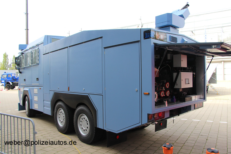 | Beschreibung: | Ziegler (PSV) Public Safety Vehicle (Wasserwerfer 9000), ausgestellt auf der GPEC 2014. Technische Daten: Hersteller Fahrgestell: Mercedes-Benz, bzw. MAN möglich Antrieb: Allrad 6x6 Pumpenaggregat: Albrecht Ziegler GmbH / Deutz Typ: FPN 15-2000 Leistung: bis zu 3000 l/min bei 15 bar Wassertankinhalt: bis zu 9000 l Material: GFK Aufbau: Albert Ziegler GmbH Material: Ganzstahlaufbau Kabine: Besatzung: Sicherheitskabine für Besatzung 1+4 Panzerung: VPAM Level 7 Sicherheit: Überdruckschutzkabine zul. Gesamtgewicht: bis 33000 kg Der Räumschild dient der Beseitigung von Hindernissen und Barrikaden vor dem Fahrzeug. Dieser ist in der Grundstellung an die Stoßstange angeklappt und stellt dadurch keine Beeinträchtigung bei Geländefahrten dar. Im Einsatzfall kann der Räumschild während der Fahrt von der Kabine aus durch den Fahrer und den Kommandanten nach unten und oben gefahren werden. Infos: Albert Ziegler GmbH & Co. KG |