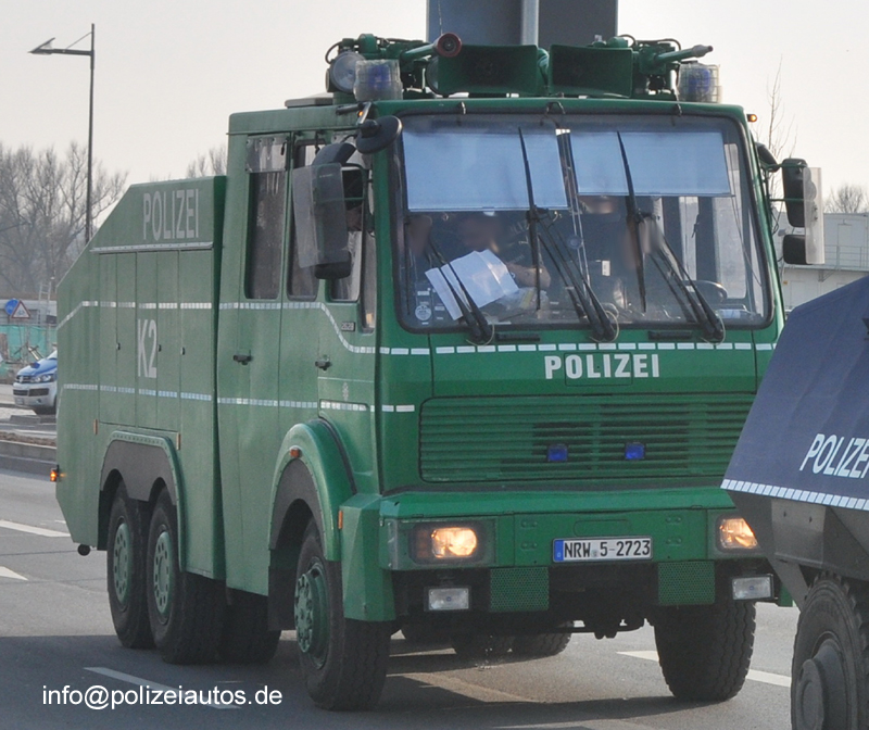 | Beschreibung: | Sonderwagen SW 4 W1 und Wasserwerfer K2 der Polizei NRW bei den Blockupy-Protesttagen im März 2015 in Frankfurt/Main. Der Wasserwerfer 9000, Aufbau Mercedes-Benz 2628, wurde nachträglich mit Reflexstreifen versehen, wobei sich die Linienführung auf dem Führerhaus gegenüber der 2634-Wawe-Ausführung und HIER unterscheidet. Die Polizei-Schriftzüge auf Tank und Führerhaus sind ebenfalls anders angeordnet/ausgeführt. Fotos: Gottung |