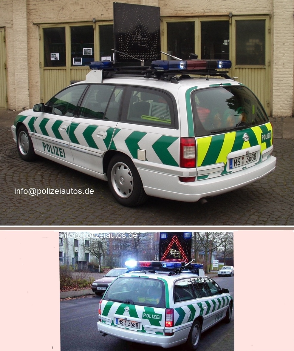 | Beschreibung: | Funkstreifenwagen der Autobahnpolizei Münster. Dieses Farzeug wurde zu Testzwecken mit einer neuen Warnbeklebung zur besseren Erkennbarkeit bei Absicherungen, 2 Blaulichtbalken (TECHNO DESIGN Wilmering GmbH Sondersignalanlagen: 2 Lichtbalken + Frontblitzer) und einer ausklappbaren Tafel zur Darstellung diverser Verkehrs- und Warnzeichen ausgestattet. |