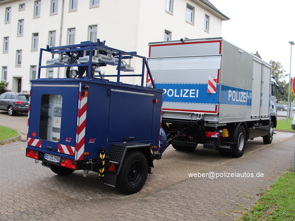 | Beschreibung: | Gerätewagen der Bereitschaftspolizei Niedersachsen mit angehängtem AVS-Lichtmastanhänger |