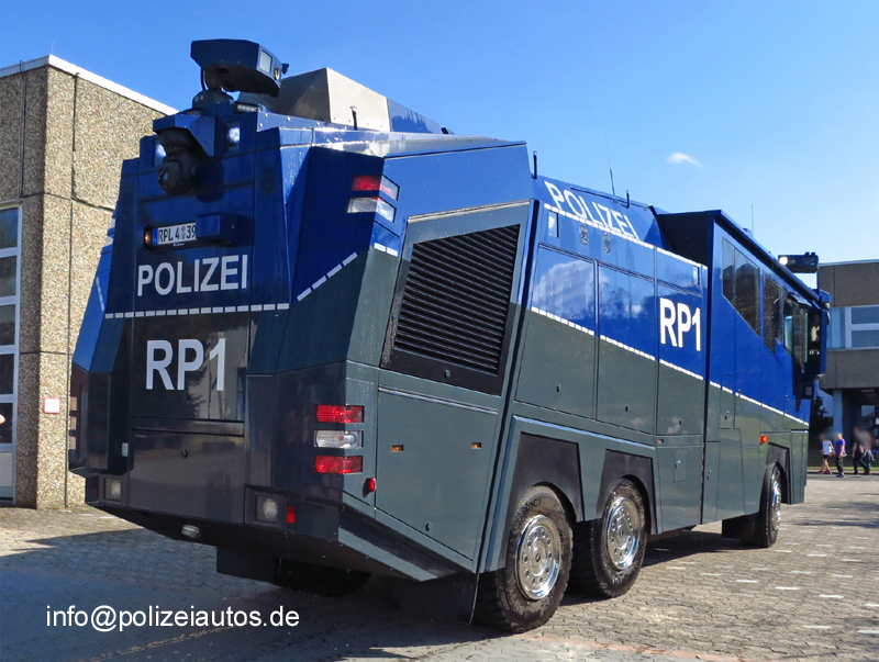 | Beschreibung: | Bundeseinheitlicher Wasserwerfer 10000 der Bereitschaftspolizei Rheinland-Pfalz, beschriftet mit der Länderkennung RP 1. |