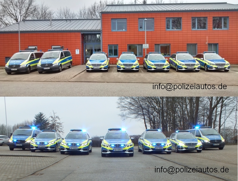 An einem ruhigen Tag konnte der gesamte uniformierte Fuhrpark einer Autobahnwache auf einem Bild vereint werden. Als Streifenwagen sind zur Zeit in Schleswig -Holstein Mercedes-Benz E-Klassen im Einsatz. Als Sicherungs- und Kontrollfahrzeuge werden Mercedes-Benz Vito verwendet. |