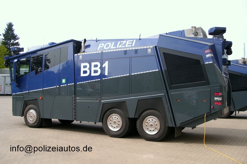 | Beschreibung: | Wasserwerfer 10000 der Polizei Brandenburg. Technische Daten: Länge: 9.900 mm Breite: 2.550 mm Höhe: 3.700 mm zul. Gewicht VA: 9.000 kg zul. Gewicht HA: 22.000 kg zul. Gesamtgewicht: 31.000 kg Fahrgestell: MB 3341 AK/42/6x6 Actros Leistung: 300 kW (408 PS) Wendekreis: ca. 20 m Kraftstoffinhalt: 300 l Batterien: 2 x 165Ah Notlaufeigenschaft aller Reifen Aufbau: Rosenbauer Kabine: Polycarbonat-Schutzverglasung mit größtmöglicher Rundumsicht, inkl. zusätzlicher Hochdruckwaschanlage, Schutzwirkung bei Durchstich sowie Steinbewurf, Brandsätze, durchschlagstabil gegen Bewurf einer Gehwegplatte aus 12 m Höhe Überdruck- und Außenluftfiltersystem Klimaanlage Zentralverriegelung Standheizung Kabinennotausstieg je Seite Wassertank: Koffertank, Inhalt: 10.000 l Wassertankheizung Pumpenanlage: Pumpe N35 mit Deutz TCD 2012L06 Kupplungssystem Storz 1 x Tanksaugleitung 1 x Fremdsaugleitung im Heck Wasserwerfer: 3 x RM12 C Anordnung: 2 x in Front, 1 x im Heck Durchflussmenge: 1.200 l/min Werfer vorne; 900 l/min Werfer hinten Wurfweite: ca.65 m / 50 m (vorne / hinten) Bedienung über Joystick. Fotos: I. Kröning |