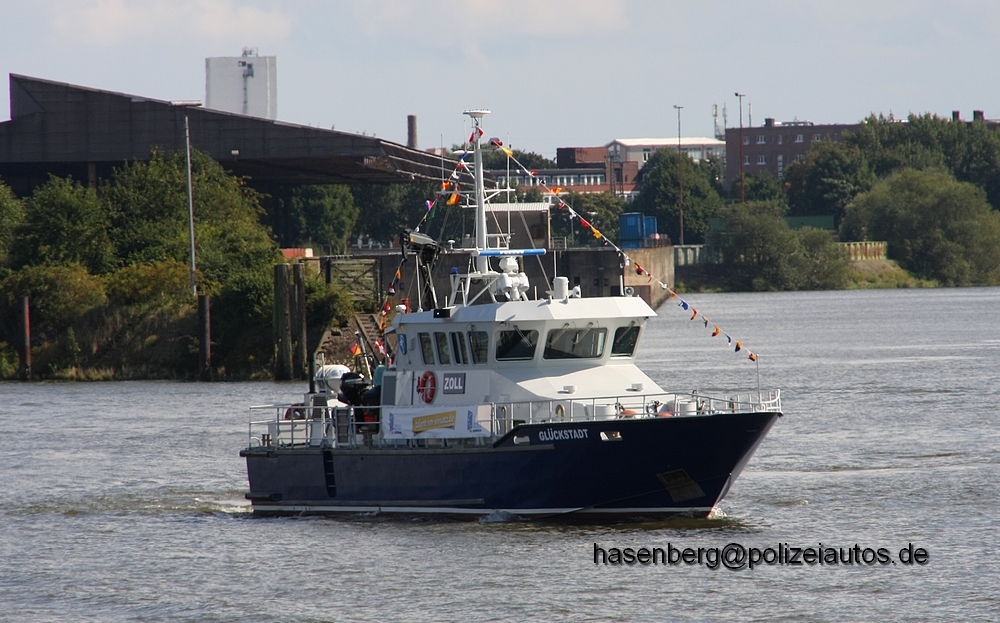 Die Bilder sind bei der Präsentation der neuen Farbgebung im Rahmen des Tages des Zolls 2017 in Hamburg entstanden. Die Glückstadt ist das erste Fahrzeug der Zollverwaltung, welches die blaue Farbgebung trägt. Die Lackierung entstand kurz vor der Präsentation im Rahmen eines Werftaufenthaltes. Nach und nach werden nun alle Wasserfahrzeuge des Zoll in dieser Farbgebung lackiert. Hier ist das Boot noch in der alten Lackierung zu sehen. |