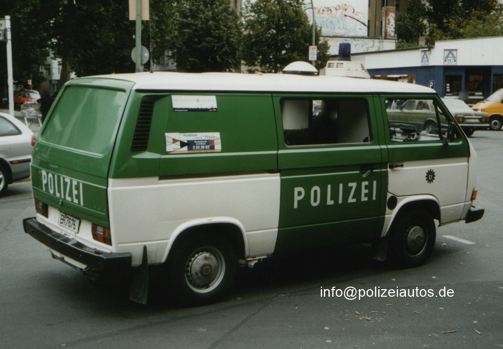 Diensthundeführerkraftfahrzeug der Polizei Berlin mit verschlossenen (verblechten) Heckfenstern.