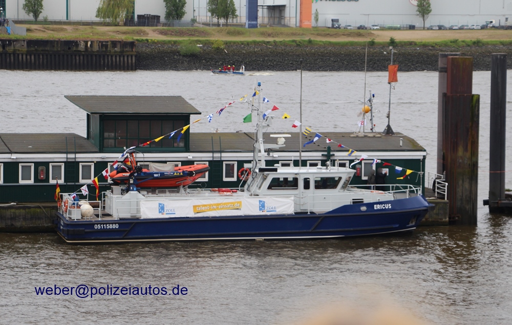 Zollboot Ericus -nun auch in kobaltblau- im Hamburger Hafen, nahe den Landungsbrücken