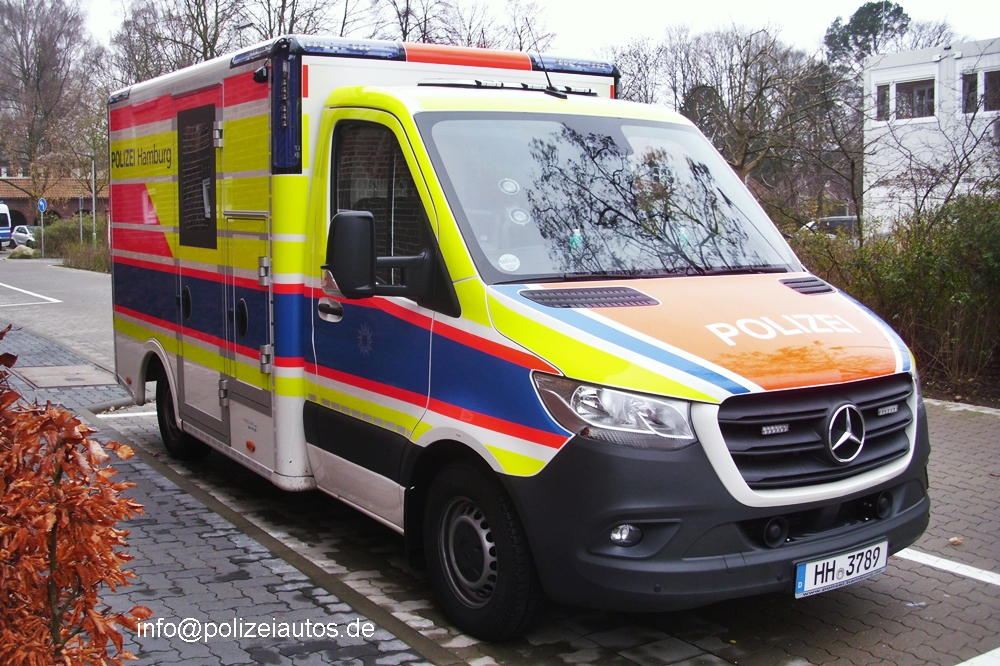 | Beschreibung: | Der bundeseinheitliche Rettungskraftwagen der Polizei Hamburg wurde inzwischen zusätzlich foliert: Polizei-Schriftzug auf der Motorhaube und am Heck, Polizei Hamburg auf den Seitenwänden, Polizeiwappen auf den Türen und großflächig gelbe Folien. Fotos: I. Kröning |