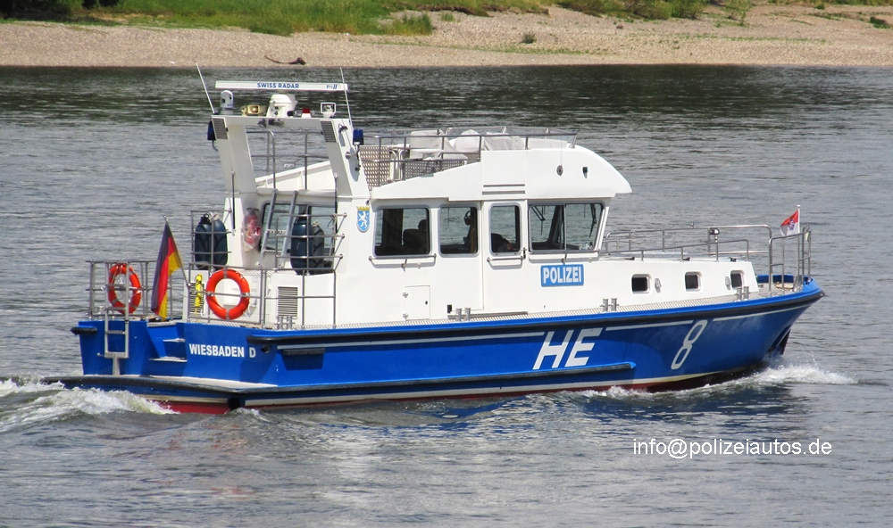 Streifenboot 8 der Wasserschutzpolizei Hessen, hier unterwegs auf dem Rhein bei Köln Mülheim.