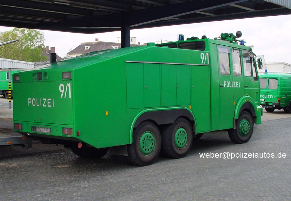 | Beschreibung: | Wasserwerfer 9000 der niedersächsischen Bereitschaftspolizei, hier mit Kennung 9/1 Technische Daten: 280 PS Höchstgeschwindigkeit: 105 km/h 16 Vorwärts- und 2 Rückwärtsgänge Wassermenge: 9070 Liter Tankinhalt Besatzung: 5 Beamte. Bei diesem Fahrzeug werden die Auspuffabgase über Edelstahlrohre (seitlich am Wassertank angebracht) nach oben abgegeben. Hier eine Ausführung ohne diese Vorrichtung. |