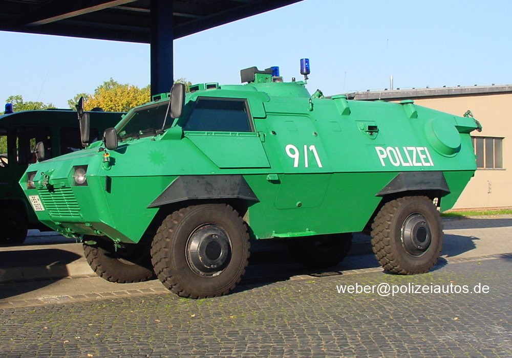 | Beschreibung: | Gepanzerter Sonderwagen (SW 4) der Bereitschaftspolizei Niedersachsen. Technische Daten 168 PS Höchstgeschwindigkeit: 100 km/h 8 Vor- und Rückwärtsgänge. Niedersächsische SW 4 und Wawe 9000 im Einsatz sind HIER zu sehen. |