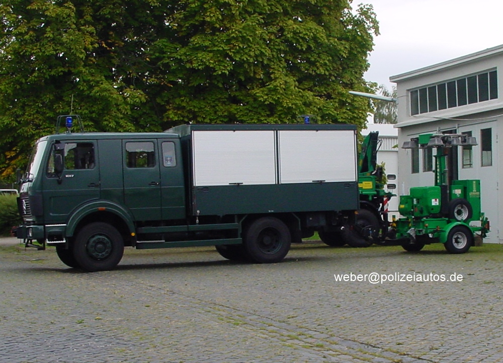 | Beschreibung: | Gerätegruppenkraftwagen der Bereitschaftspolizei Niedersachsen. Das Fahrzeug wurde aus den Beständen des BGS übernommen. Zugfahrzeug für Lehmann, Lichtmastanhänger |