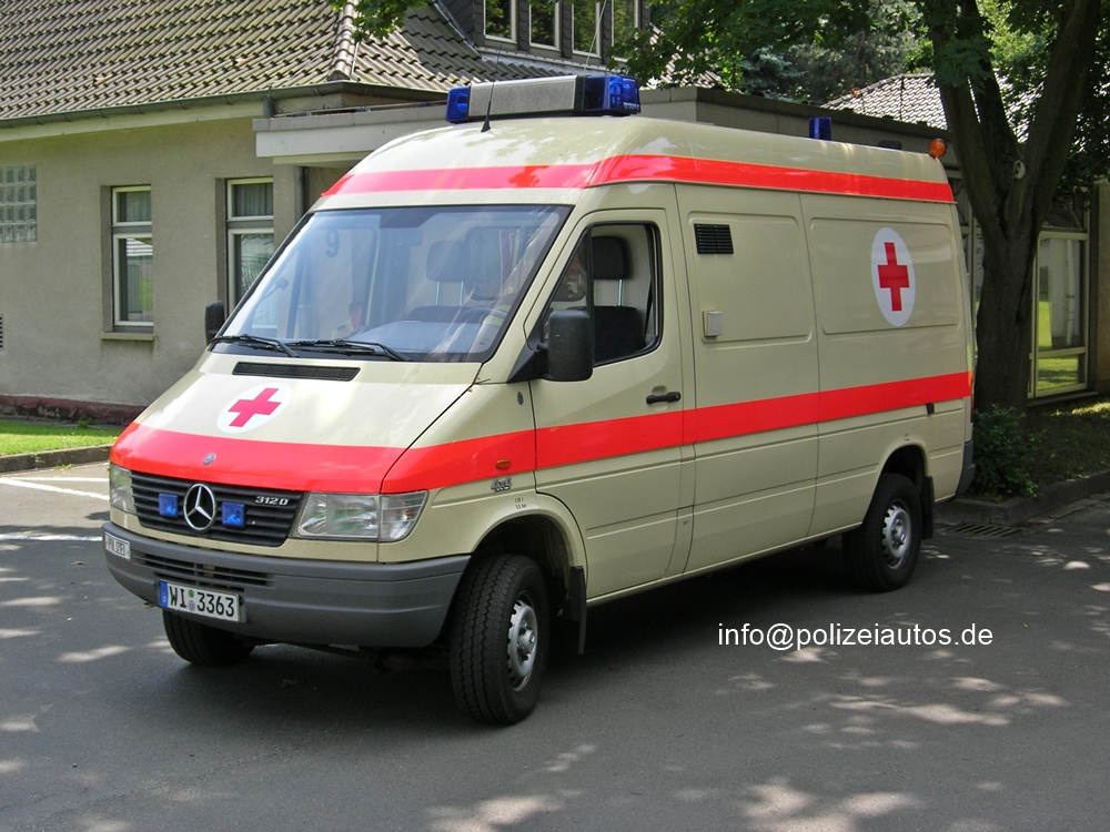Rettungswagen der hess. Bereitschaftspolizei mit zusätzlichem POLIZEI-Schild an der Stoßstange.