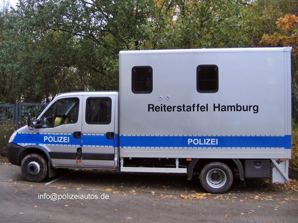 | Beschreibung: | Pferdetransporter der Hamburger Reiterstaffel. Bei Bedarf können auf das Dach der Fahrerkabine zwei Magnetblaulichter aufgesezt werden. Technische Daten Leistung: 125kW/ 170 PS zul. Gesamtgewicht: 6,5 t, Platz für 6 Beamte und 2 Pferde. Foto 3: Michael Hinz Foto 4: I. Kröning |