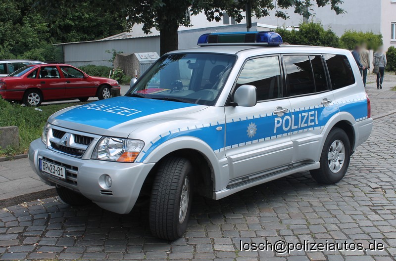 | Beschreibung: | Pkw Fu, gl - geländegängiger Funkstreifenwagen. Der Mitsubishi Pajero wird als Multifunktionsfahrzeug genutzt, u.a. als Führungsfahrzeug, als Zugfahrzeug für Transportanhänger, im Instandsetzungsdienst und beim Entschärfertrupp eingesetzt. Gegenüber diesem Fahrzeug sind Polizei-Schriftzug und Bundespolizeiwappen anders angeordnet; bei Indienststellung hatte der Pajero noch eine identische grüne Folienbeklebung. |