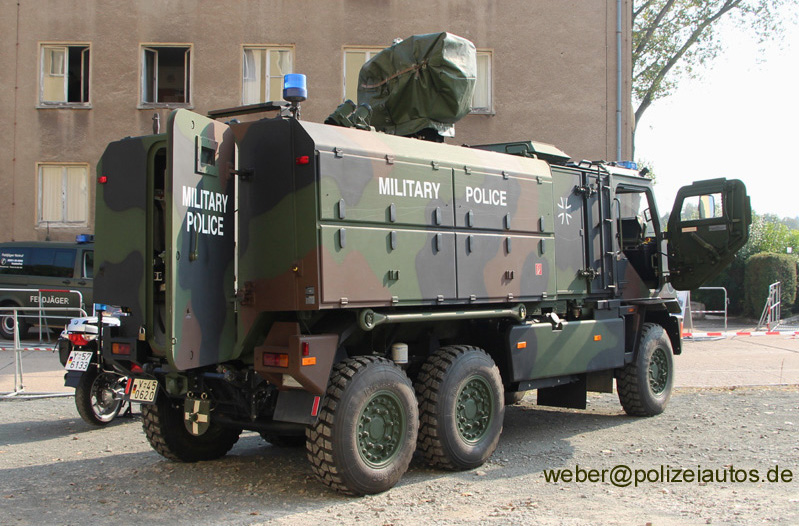 Dieser Fahrzeugtyp dient den Feldjägern zum geschützten Transport von Mannschaften. Auf dem Mehrzweckaufbau (MZA) ist hier eine Waffenstation montiert, aber abgeplant. Dieses Fahrzeug wurde zusätzlich auf allen vier Fahrzeugseiten mit MILITARY POLICE beschriftet. |