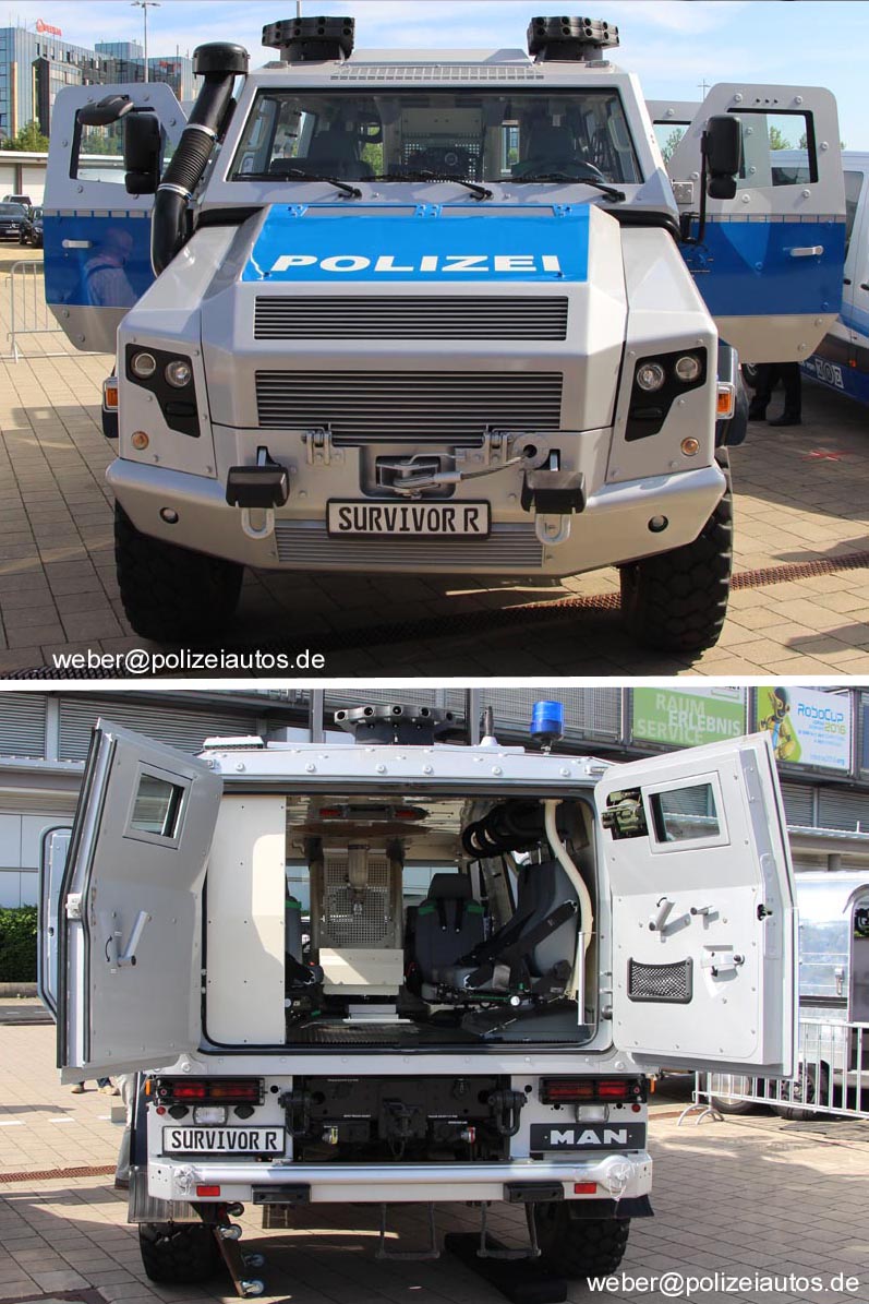 | Beschreibung: | Auf der GPEC 2016 war der Survivor R in der Polizeiausführung ausgestellt. Entwickelt wurde das Fahrzeug gemeinsam von Rheinmetall MAN und Achleitner. Technische Daten Zul. Gesamtgewicht: 15000 kg Leergewicht: 10900 kg Motor: MAN 6,9 Liter, Sechszylinder Leistung: 330 PS / 242 kW Treibstoff: Diesel / Kerosin max. Geschwindigkeit: 100 km/h (abgeriegelt) Fotos: Gottung u.a. |