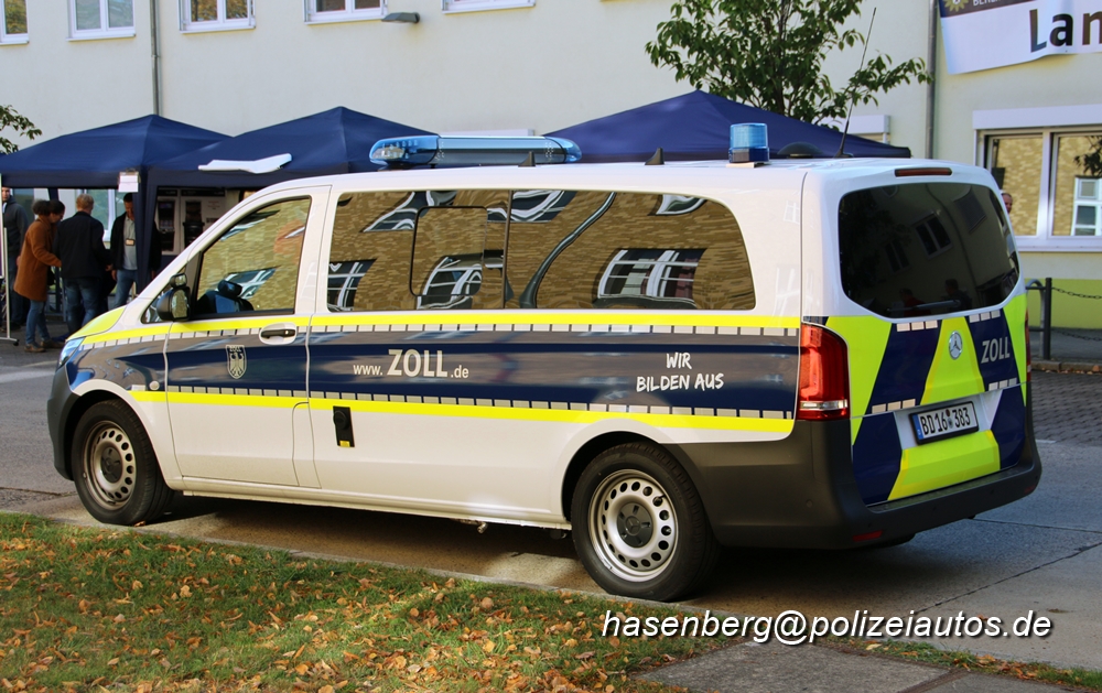 Ausgebaut durch die Fa. Binz in Illmenau. Im Einsatz seit 2019. Diese Fahrzeuggeneration ist die erste die in der neuen Farbgebung des Zoll ausgeliefert wird (blau mit VESBA Design Beklebung). Auf der Motorhaube und hinter der Heckscheibe befindet sich der Anhaltesignalgeber. |
